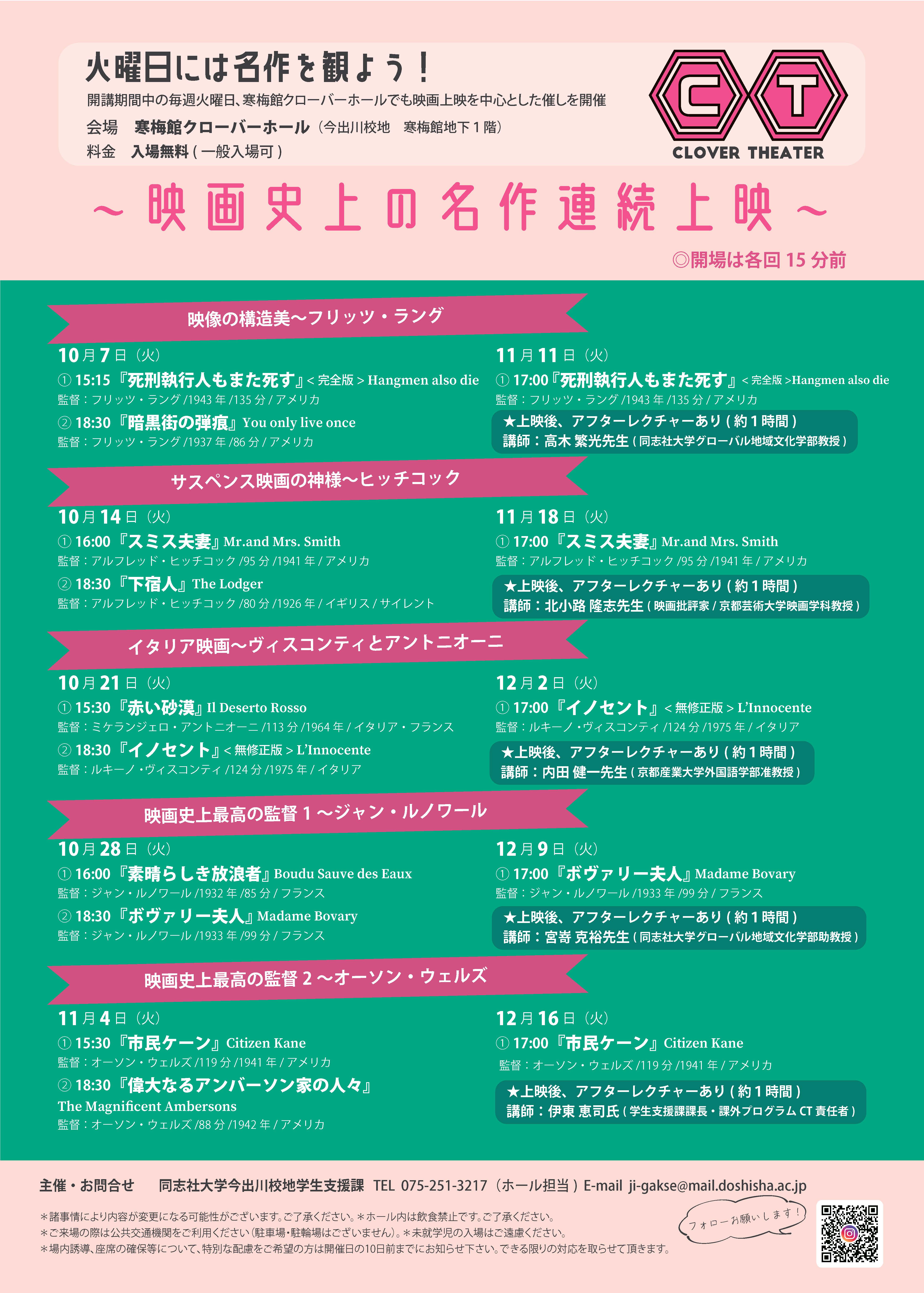 開講期間中の毎週火曜日、寒梅館クローバーホールでは映画上映を中心とした催しを開催しています。