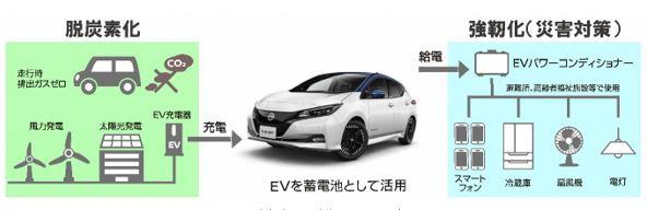 - 京田辺市で災害を起因とする停電が発生した際、京都日産自動車の販売店舗に配備しているEVを無償貸与し、避難所等の非常用電源として活用する。