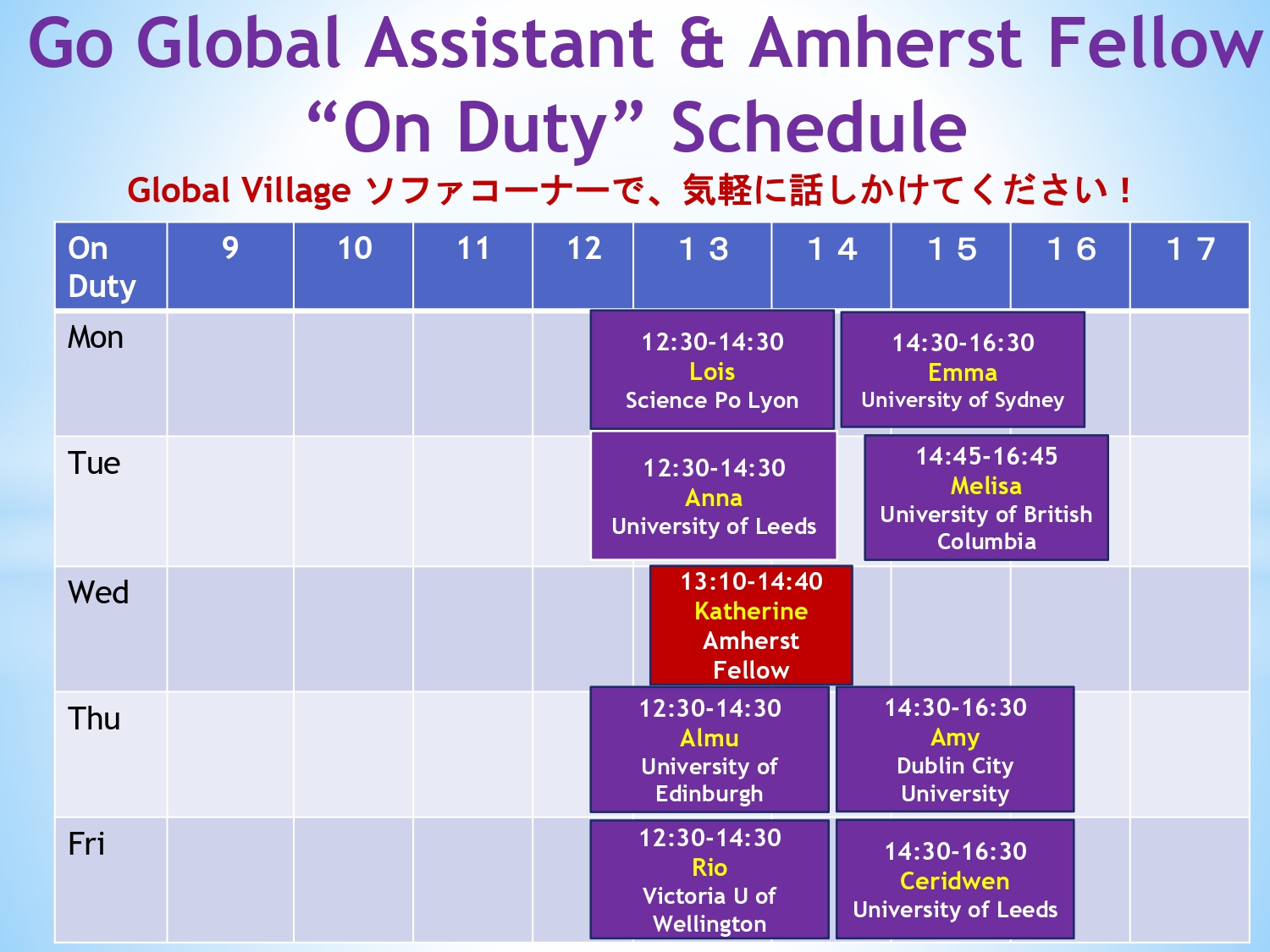 "Go Global" Assistant 各"Go Global" Assistantのプロフィール等詳細はこちらから確認してください。 |